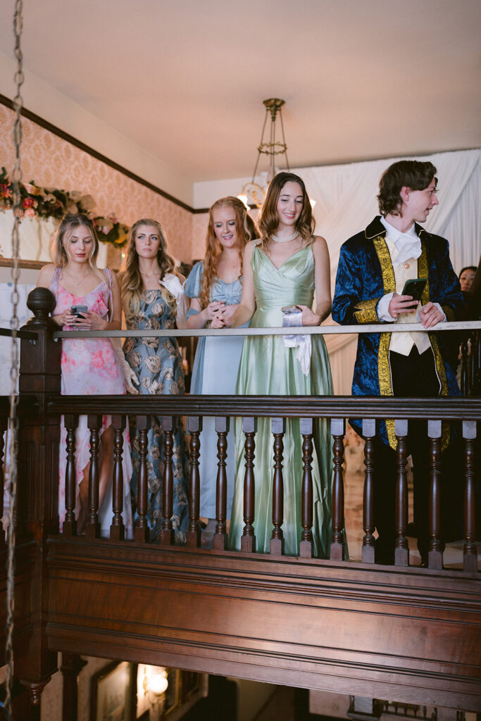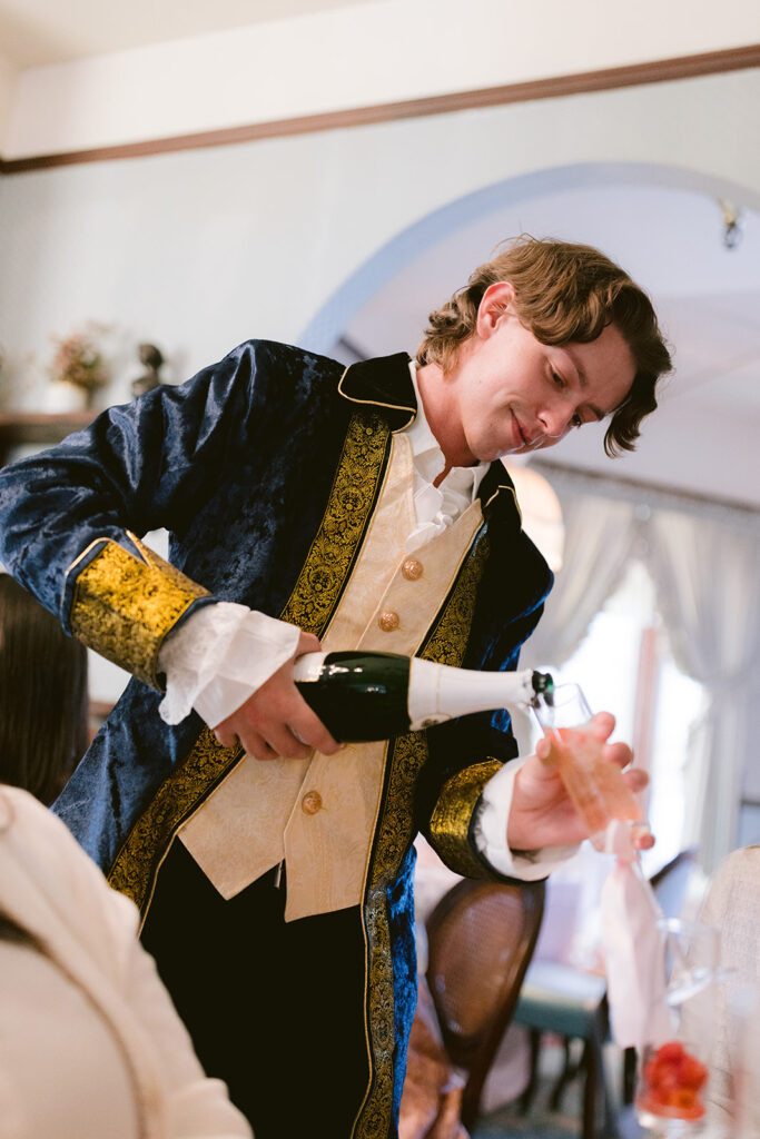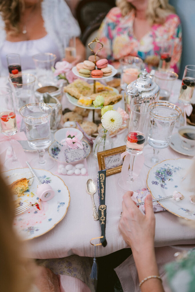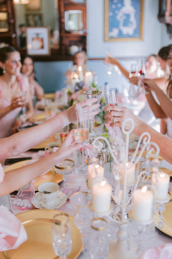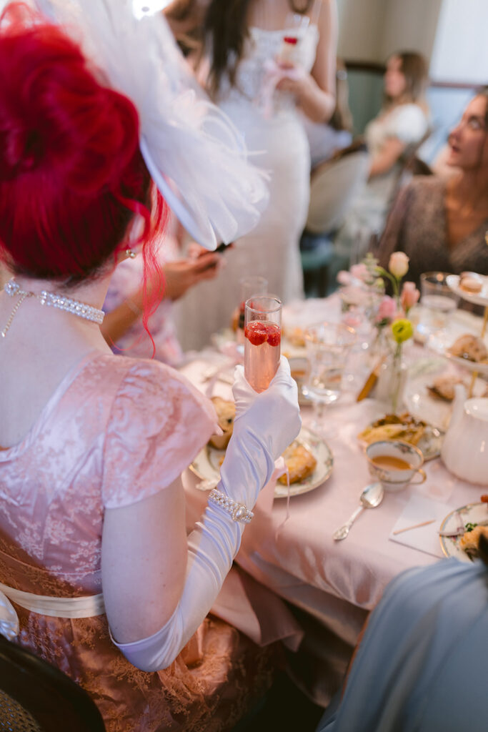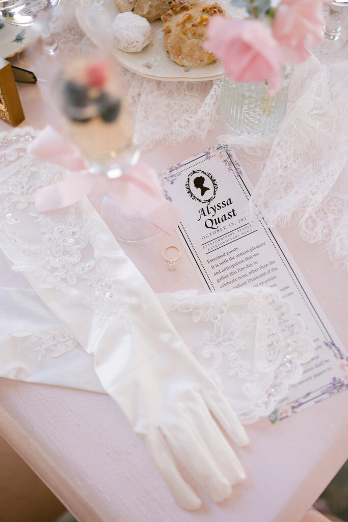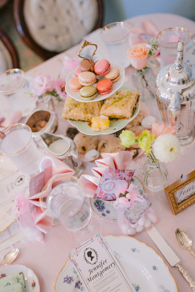 Each detail felt like a love letter to beauty herself. Handcrafted pastries, delicate tea cups, and florals by @stemspetalsandvines wove together in a palette of blush and cream. Guests gathered in their finery, composing playful Regency-style toasts that carried both wit and warmth, filling the historic halls with a joy that felt eternal.