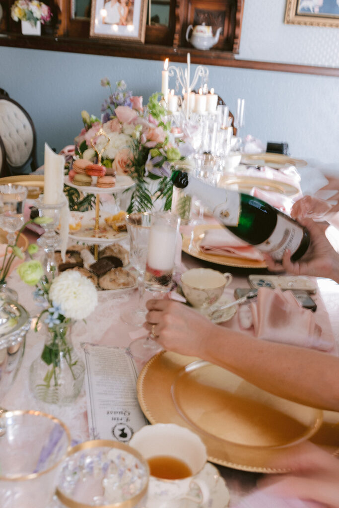 Soft sunlight spilled across silver trays and pastel blooms, wrapping the morning in a gentle kind of magic. Beneath the chandeliers of Edwards Mansion, time seemed to slow, and the air hummed with laughter, lace, and the scent of fresh florals. This Bridgerton-inspired bridal brunch unfolded like a Regency fairytale… a dream of silk ribbons, heirloom china, and the soft murmur of champagne toasts.
